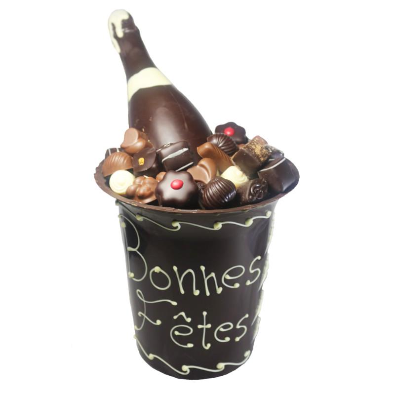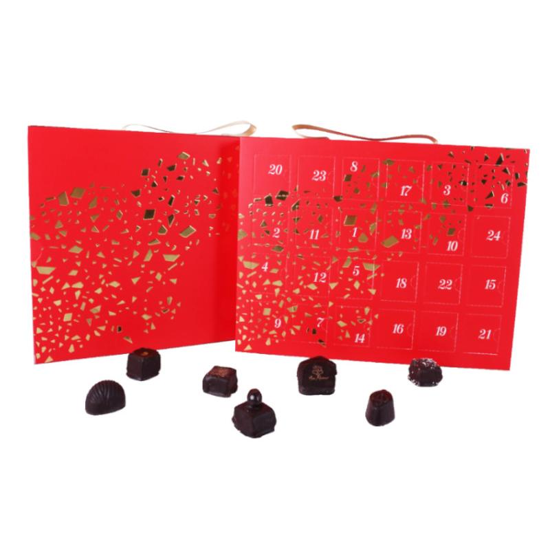 Ingrédients : chocolat noir 72% (pâte de cacao, sucre, beurre de cacao, émulsifiant : lécithine de soja, extrait naturel de vanille), chocolat blanc (sucre, lait entier en poudre, beurre de cacao, émulsifiant : lécithine de soja, extrait naturel de vanille), denrée alimentaire colorante rouge (concentré de radis, cassis et pomme),chocolat noir 50%, chocolat noir 72% de cacao, eau, sucre inverti, glucose, arômes alimentaires (violette, menthe, noix de coco), transfert pour impression alimentaire (beurre de cacao, sucre, colorants E172, E100), épices (cannelle, gingembre, girofle, muscade, sel, poivre), café, rhum traditionnel Negrita (8%), chocolat au lait, caramel, chocolat blanc, noisettes, brisures de crêpe dentelle, arômes alimentaires (citron, cannelle), amandes, noix de cajou, pruneaux, écorces d’orange, pâte d'amande BI 50%, arômes alimentaires (rose, amande amère).